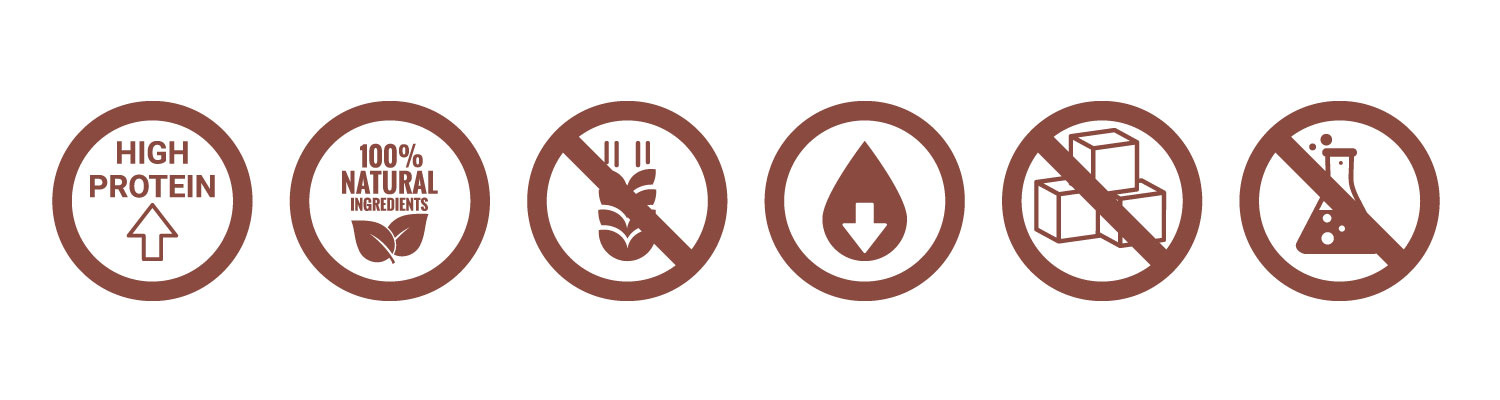- Czysty skład – bez zbóż, glutenu, cukru i ulepszaczy