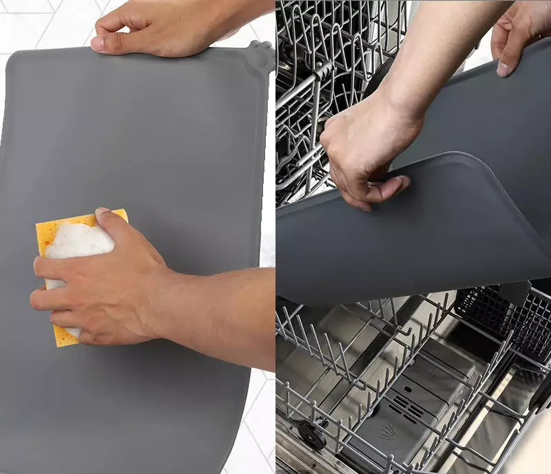 - Podwyższone brzegi maty zapobiegają przedostaniu się wody, pokarmu na podłogę